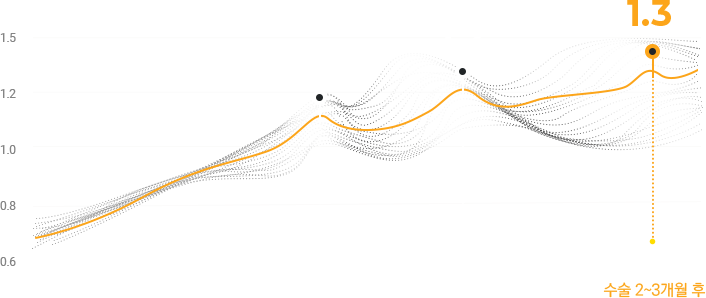 눈에미소안과 수술결과 데이터를 임의 표본추출해 분석한 결과, 수술 후 시력 1.0 이상을 기록하는 환자 비율이 수술 2주 경과 후 약 87.7%, 2개월 경과 후 약 93.0%, 3개월 경과 후 약 96.5%를 넘는 놀라운 결과를 나타냈습니다.